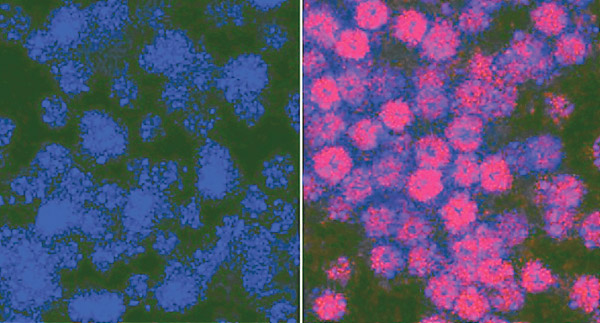 En la imagen, la piel de un ratón después de usar la crema (izquierda) y sin usarla (derecha). El color rosa marca el daño celular por la radiación UV. (I)