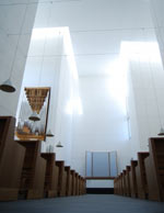 Por un juego de luces que ingresa desde la cubierta se observa en el techo una cruz asimétrica.