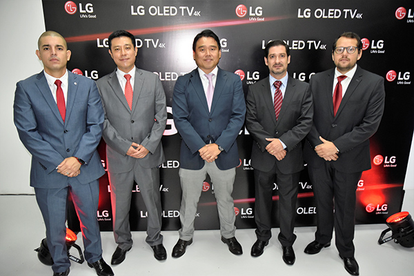 “LG Electronics se ha caracterizado siempre por ofrecer tecnología inteligente y diseños estilizados para que sus usuarios disfruten momentos únicos y felices. Estos modelos estarán disponibles en 55 y 65 pulgadas”, declaró Javier Baldeón, jefe de categoría de televisores de LG Ecuador; quien aparece último junto con Tonny Villamar, gerente de Marketing de LG Electronics; Paul Jung, director comercial LG Electronics; Hugo Ma, presidente LG; y Pablo Izurieta, gerente de Negocios LG Electronics.