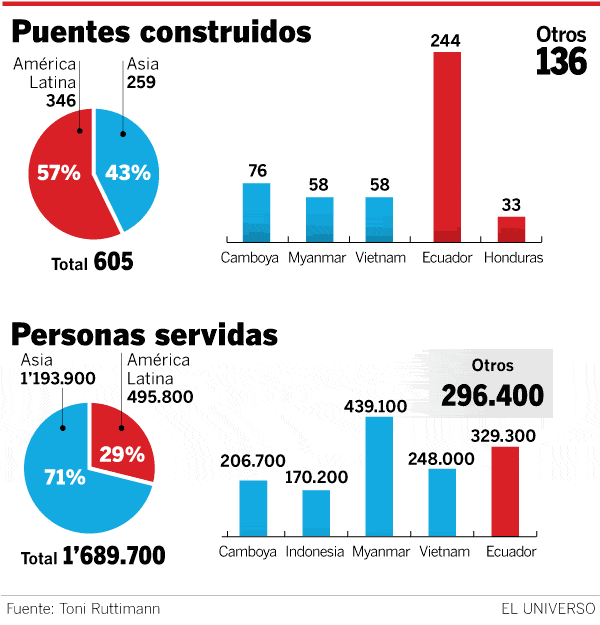 No tengo todavía censos reales de los otros puentes en Camboya, Laos, Myanmar e Indonesia, ni tampoco en Ecuador ni en los demás países latinoamericanos. Sin embargo, con la referencia de Vietnam estimamos que todos los 605 puentes construidos por los campesinos aseguraron su paso sin sufrimiento 48 millones de veces durante el 2012. En comparación, 48 millones al año es lo que se movilizó de pasajeros en todo el 2011 en el nuevo aeropuerto de Bangkok. Y nosotros en los puentes no estamos contando las noches todavía.