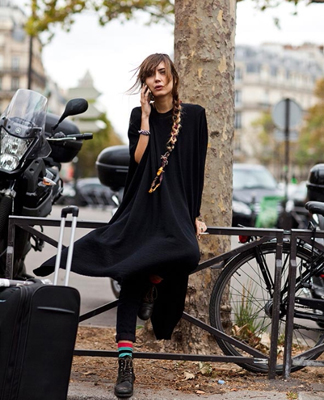 En París y Nueva York dos fachas “oscuras”; pero irreverentes... ¡de impacto! Una parisina en algún parque de la Ciudad Luz con un atuendo totalmente flojo, debajo de este una leggins.