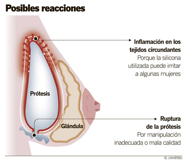 “Si la prótesis se rompe o se le hace un pequeño orificio –filtración– por alguna manipulación inadecuada o por ser de mala calidad, el contenido de este puede salir y esparcirse en los tejidos circundantes”. Si es solución salina provocará inflamación y reabsorción, pero si es gel de silicona podría causar el aparecimiento de siliconomas, inflamación e infección crónica a más de deformidad y asimetría mamaria”.