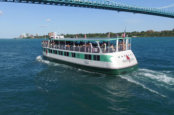 El paseo fluvial abarca las vistas del centro de la ciudad, incluyendo el puente Ambassador, que une a esta ciudad del estado estadounidense de Míchigan con Windsor, en la provincia canadiense de Ontario.